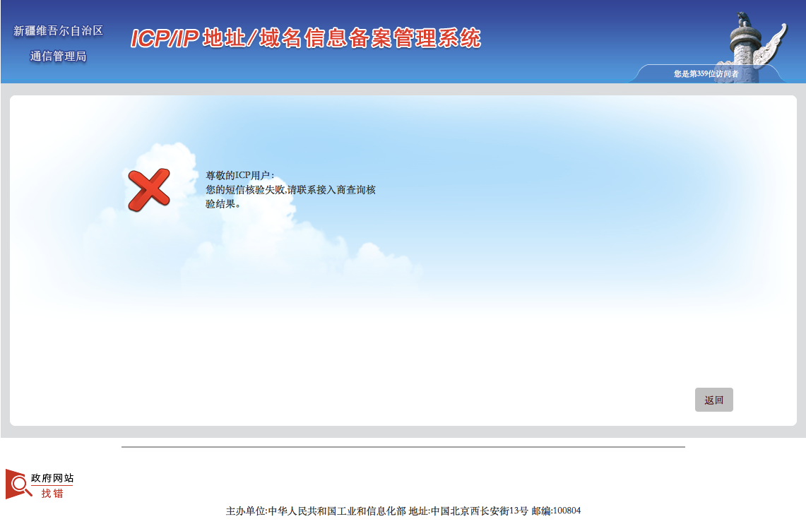 如果負(fù)責(zé)人證件號(hào)碼輸錯(cuò) 5 次以后,系統(tǒng)提示短信核驗(yàn)失敗。您的備案申請(qǐng)信息將被工信部系統(tǒng)退回。
